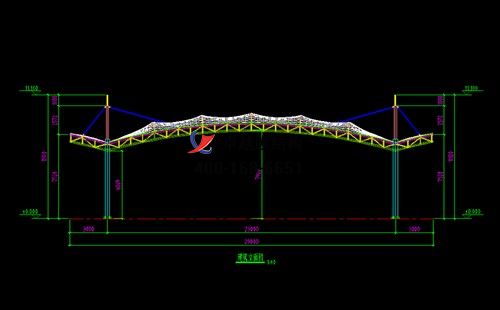 本工程膜材采用白色高端國產星益達PVDF高自潔環保建筑膜材,鋼結構采用更好的標準Q235B鋼材,表面采用酚醛底漆處理,面漆采用白色鋼結構專用快干磁漆。
